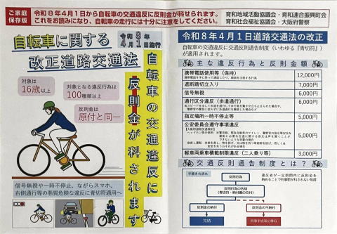 大阪府警察HP 自転車の交通違反に対する交通反則通告制度の適用について(令和8年4月1日施行)